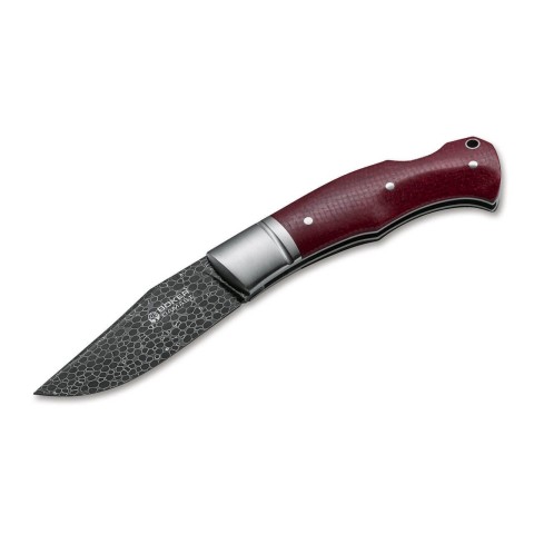 Boker Boxer, розроблений майстром Рафаелем Дюраном з Тьєра, являє собою класичний дворучний ніж. У цій особливо благородній версії традиційний кишеньковий ніж оснащений темним клинком з дамаска з візерунком драконячої луски від Берті Ритвельда, загартованим до твердості 58 HRC. Південноафриканський виробник нестандартних ножів вважається першим в країні ковалем дамаської сталі. З 1991 року він виробляє високоякісний дамаск з незвичайними візерунками. Лезо закривається міцним замком і прикрашене великим рікассо. Декоративні больстери з нержавіючої сталі мають типові для робіт майстра Дюрана вигини. Обкладки рукояті виготовлені з полірованої червоної мікарти на мішковинній основі. Зручний розмір: це ідеальний компроміс між місткістю кишень і універсальністю застосування. Модель виготовлена вручну на фабриці ножів Boker в Золінгені. Поставляється з індивідуальним серійним номером та коробці з сертифікатом відповідності.