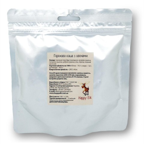 Горохова каша Happy Elk з овочами-наша каша виходить повітряної, а сухі овочі пом'якшують її смак. Заправка з цибулі, моркви робить смак страви винятковим. Увага! Для того щоб горохова каша добре запарилася, її необхідно дуже ретельно перемішати, оскільки вона дуже швидко вбирає вологу, і якщо її перемішати не досить якісно, вгорі пакета вона буде готова, а всередині і біля стінок пакета - суха. Горохова каша з овочами - класика української кухні. Відмінно втамовує голод і надає енергії для нових звершень.