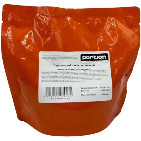 Готова страва Portion Суп гречаний з м’ясом свинини – це повноцінний та поживний обід, який завжди під рукою. Суп у реторт-пакеті зручно брати з собою в дорогу, на роботу або на відпочинок. Він не потребує особливих умов зберігання та швидко готується.