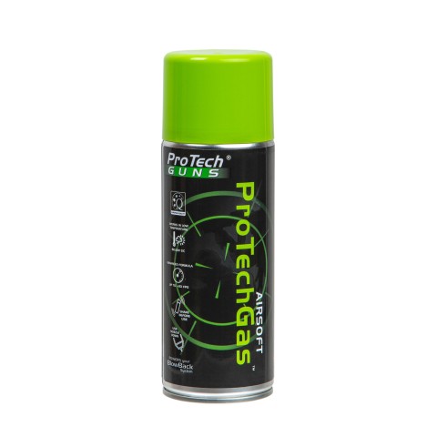 Грін-газ Pro Tech Green Gas може використовуватися у будь-якому відповідному airsoft-приводі без ризику пошкодження деталей — завдяки оптимально підібраному тиску. Містить силіконове мастило для змащування і захисту механізмів приводу. Фізичний об'єм балону становить 400мл., а фактичний вміст газу 520мл.