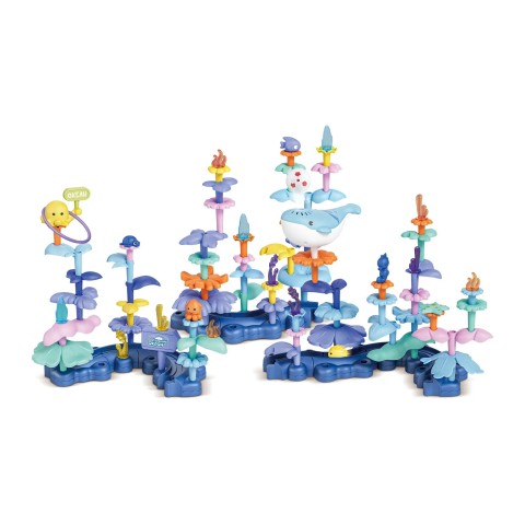 Конструктор для моделювання підводного світу з  ігровими фігурками океанічних мешканців у комплекті. Великий кит, що видуває м’ячик у повітря і творить справжню магію левітації. Ковзка доріжка для пересування підводних персонажів. Кільця в наборі для накидання на квіти та тренування влучності. 108 деталей в наборі для розвитку дрібної моторики, логіки та фантазії.