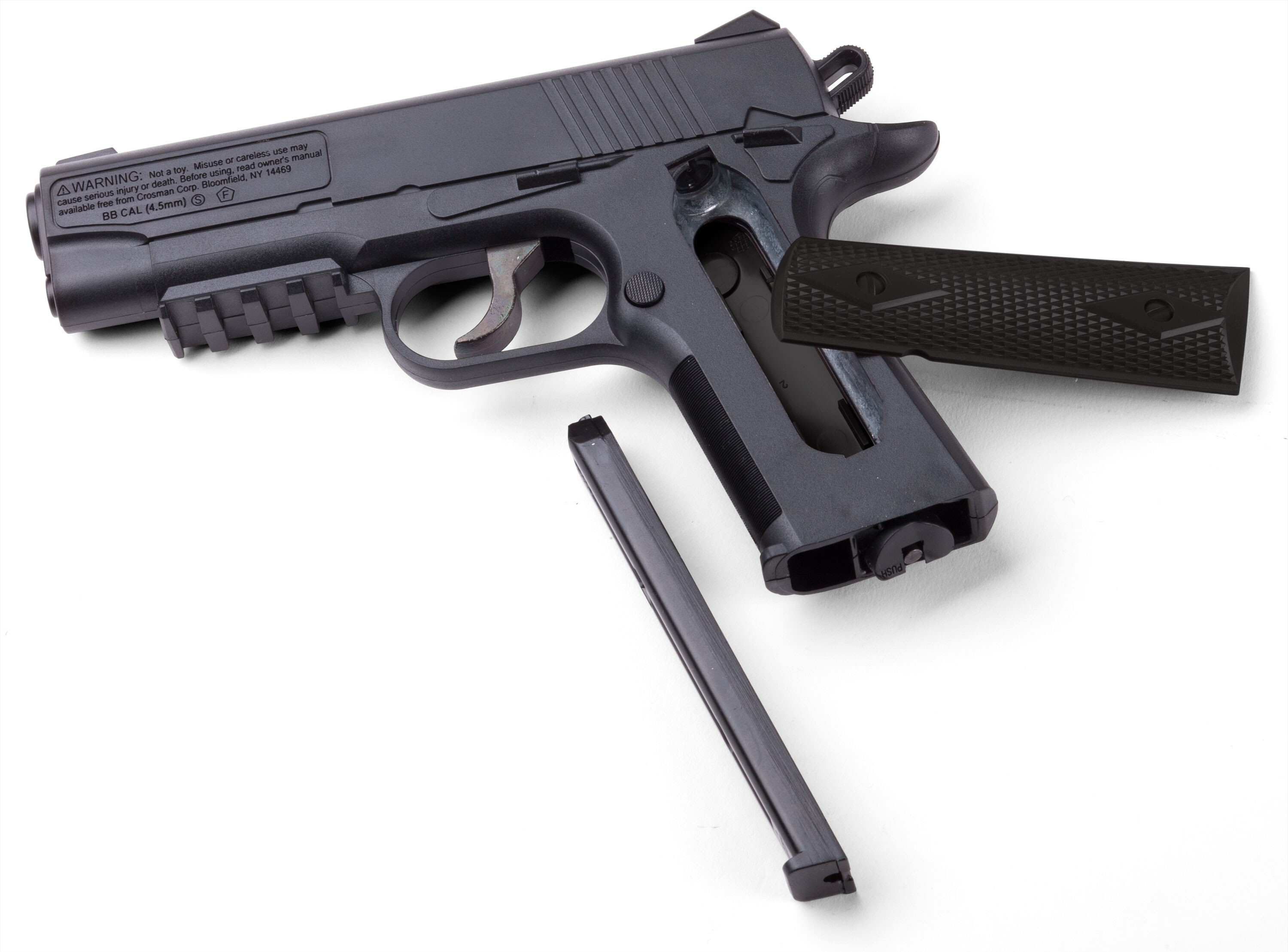 ДетальнішеCrosman є практично синонімом пневматичної зброї в Сполучених Штатах. Компанія почала виробляти пневматичні гвинтівки ще в 1924 році, рік за роком вдосконалюючи технології. Сьогодні пневматичні гвинтівки та пістолети Crosman вважаються одними з найкращих у світі, новаторами галузі, які встановлюють стандарти якості та технологій у всьому світі. Пневматичні пістолети Crosman прості в обслуговуванні, надійні і точні, що робить їх відмінним спортивним аксесуаром для активного відпочинку. А пневматичні рушниці Crosman, завдяки високій точності і в поєднанні з величезним вибором аксесуарів, відмінно підходять для професійних тренувань або полювання на дрібну дичину. Пневматичний пістолет, схожий на знаменитий армійський Кольт. Відмінний вибір для тих, хто любить постріляти заради розваги або потребує зброї для тренувань. У виробництві використовується протиударний пластик - тому вага невелика. Він має калібр 4,5 мм і стріляє сталевими кульками типу ВВ. Також при необхідності можна встановити додаткові пристрої - наприклад, ліхтарик або лазерну указку