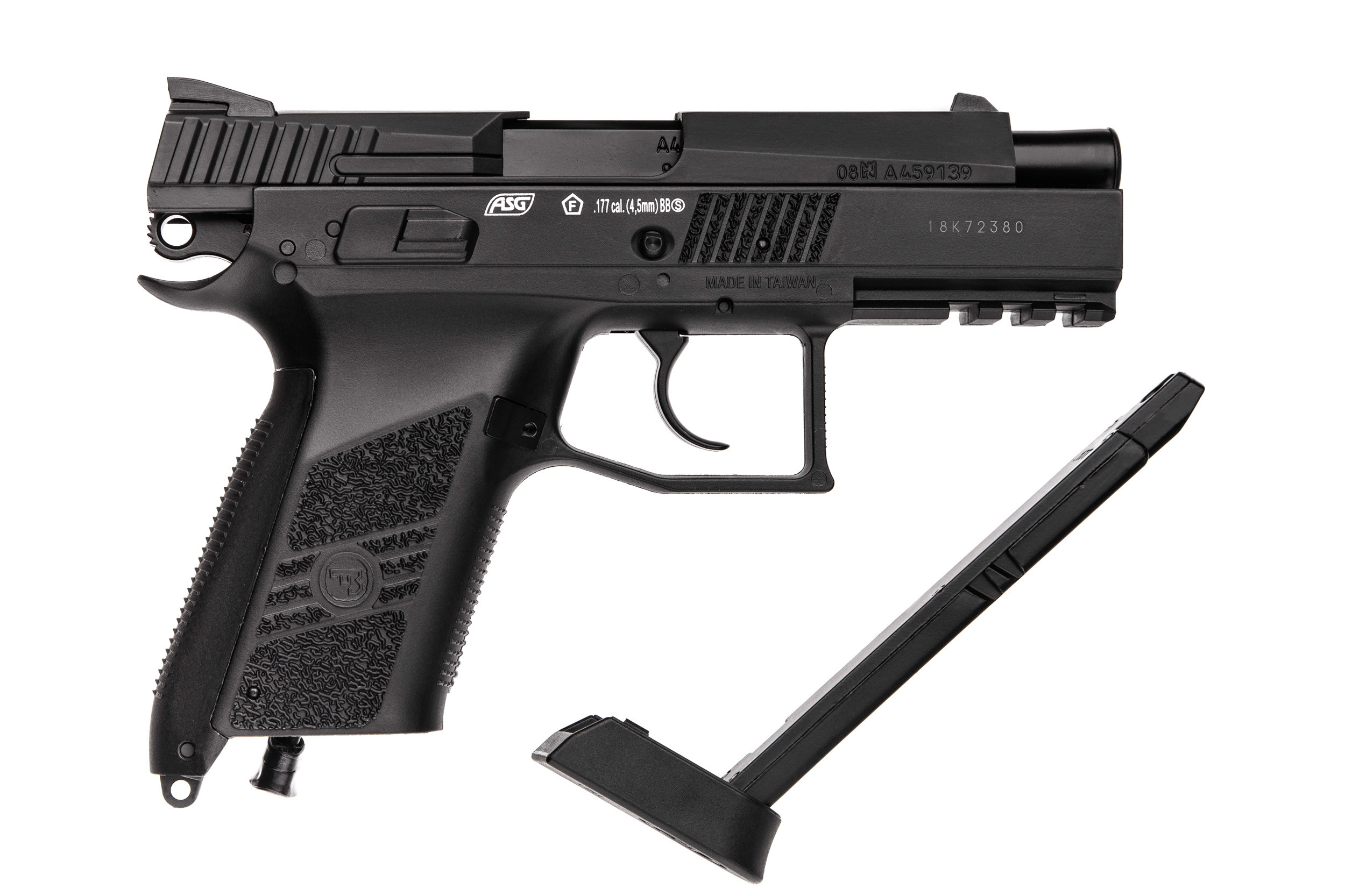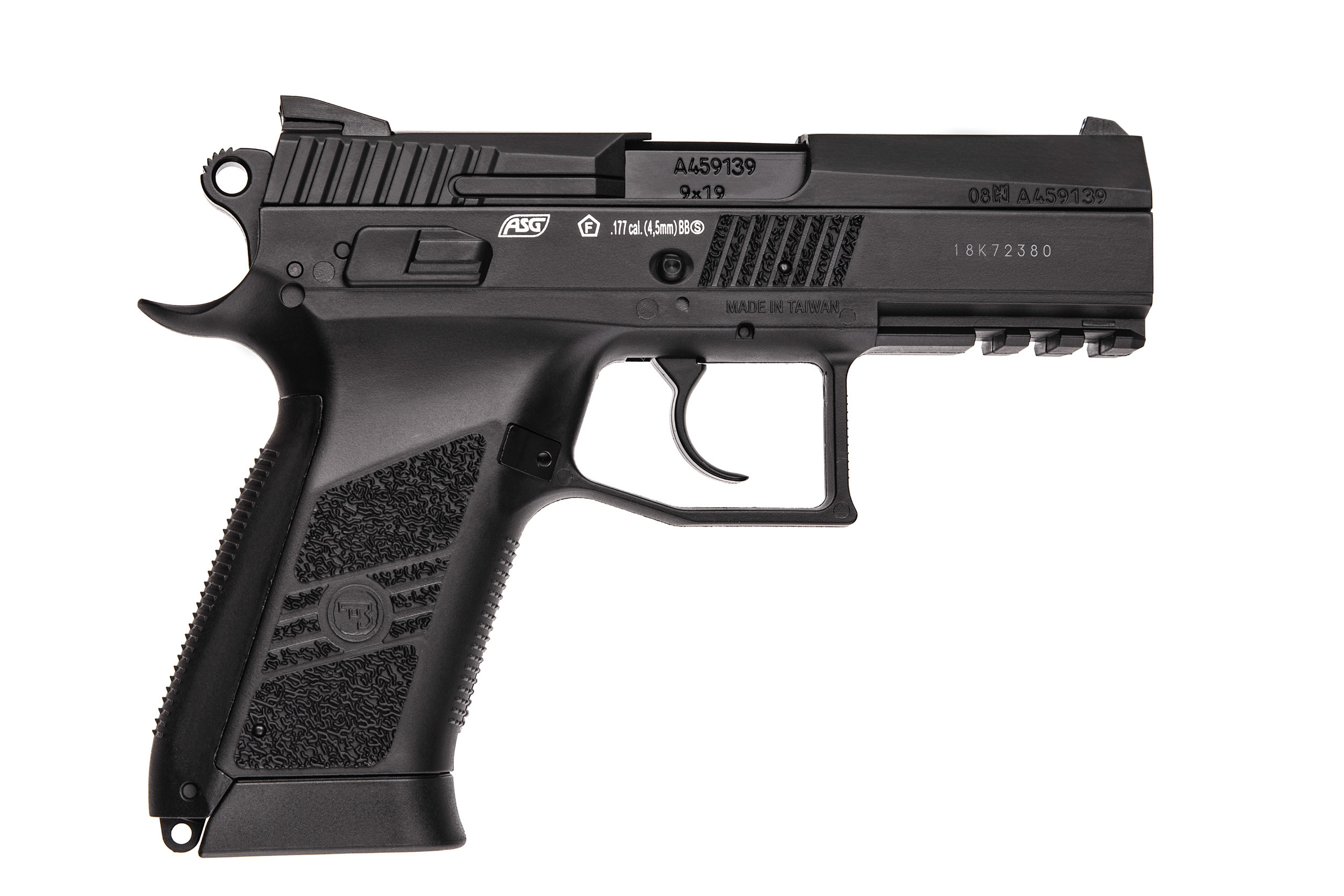 ДетальнішеПродукція ASG виробляється за ліцензіями компаній-виробників вогнепальної зброї Česká Zbrojovka, Steyr Mannlicher, STI, Dan Wesson та інших. Тому моделі ASG мають усі автентичні маркування, а також унікальний серійний номер. Постріл робиться за допомогою порції газу, який виділяється зі стандартного балона з CO2. Зовнішня конструкція даного пістолета повністю запозичена у чеського пістолета CZ-75, а саме у його модифікації CZ 75 P-07 Duty. Ця тактична різновид знаменитого пістолета мала переформовану затворну оболонку з полімеру. У пневматичної версії АСГ корпус як і раніше металевий. Крім того, конструкція пістолета дозволяє жонглювати затвором-гільзою, імітуючи використання справжнього пістолета (є навіть функція затворної зупинки). На стовбурі є нарізи для установки звукового модератора. Інтегрований під ствол профіль Weaver дозволяє при необхідності встановити ліхтарик або цілевказівник. Магазин, який знімається за допомогою кнопкового механізму, служить лише місцем зберігання кульок. Для установки і фіксації балона CO2 передбачена спеціальна камера, розташована в задній частині ручки. Пістолети ASG моделі CZ 75 P-07 Duty випускаються як у звичайній версії, так і у версії з імітацією перезарядки - BLOWBACK. Функція BLOWBACK абсолютно не впливає на політ м'яча, створюючи при цьому відчуття використання бойового пістолета.