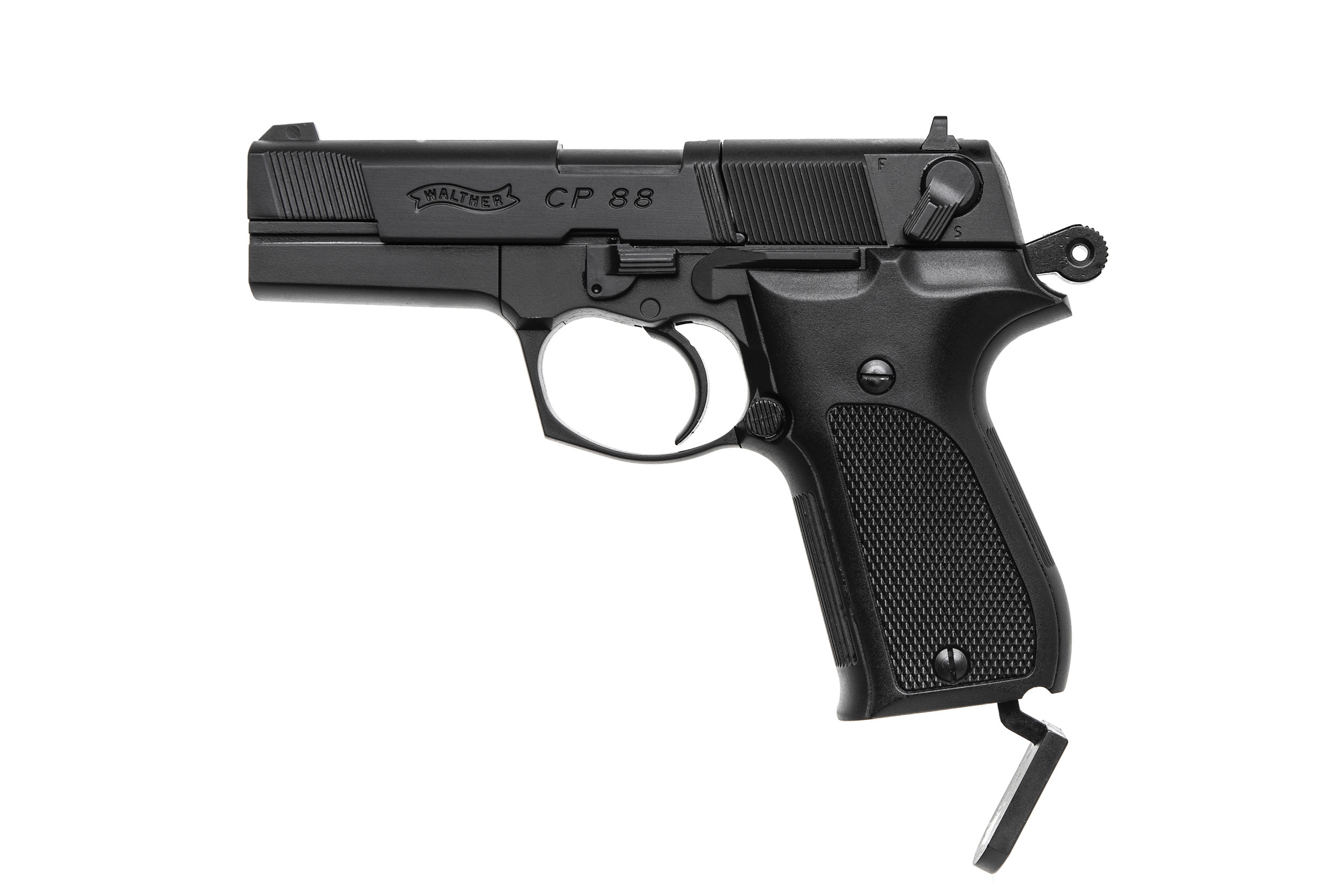 ДетальнішеUmarex Walther Mod.CP88 4 - копія вогнепальної зброї Walther P88. Пістолет призначений для стрільби свинцевими кулями та використовує кліпсові барабани (на 8 куль кожен) для них. Використовуються для особливо прицільної стрільби та різноманітних змагань. Відрізняються високою надійністю та точністю стрільби.
