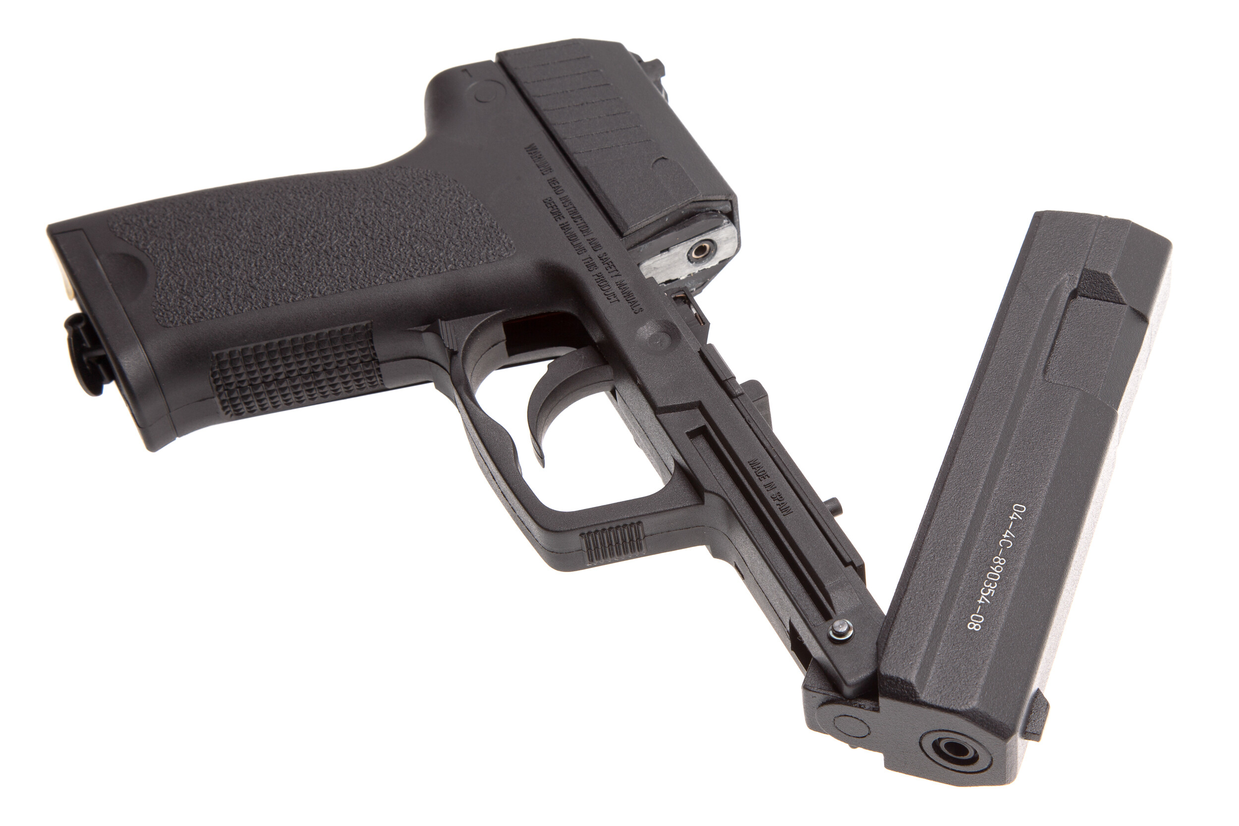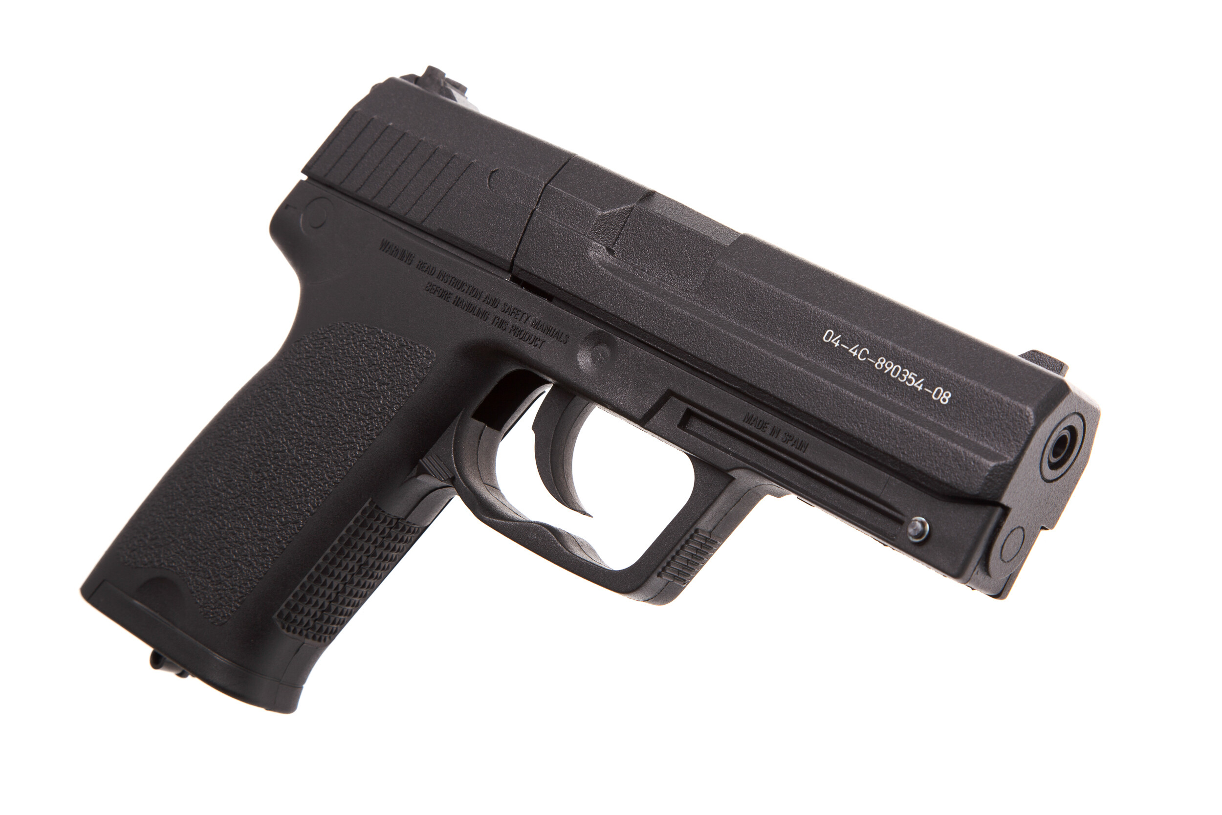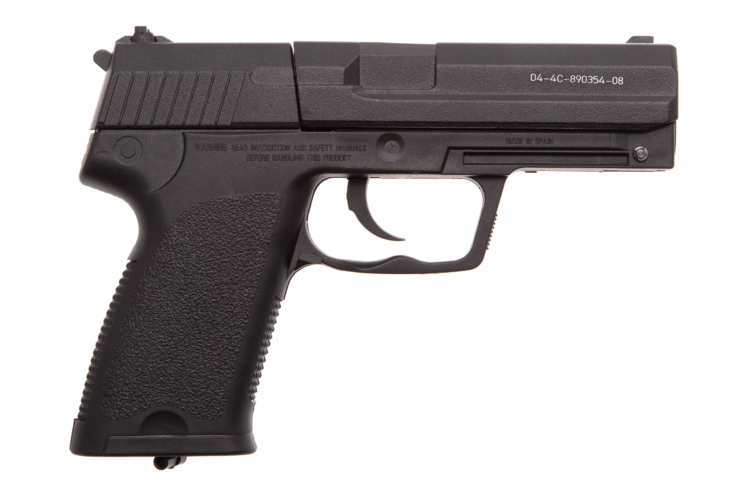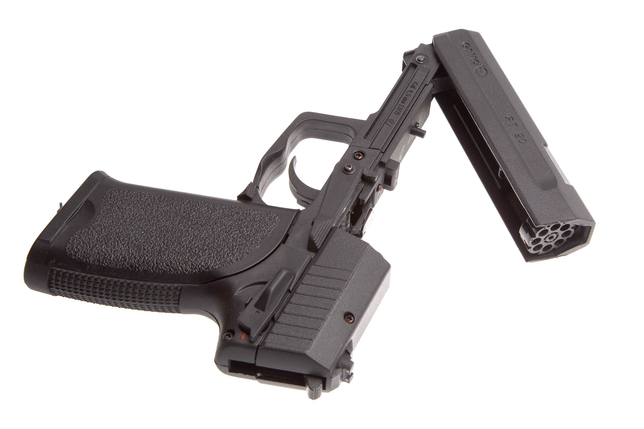 ДетальнішеGamo PT 90 – пневматичний газобалонний СО2 восьмизарядний пістолет, боєприпаси (кулі типу Diabolo) заряджаються в барабан, який встановлений в корпусі, одного балончика вистачає приблизно на 60 пострілів.Gamo PT 90 – це надійна та безпечна модель, яка має високі технічні характеристики.Встановлена регульована мушка, так само можливе регулювання цілика.Підствольна планка призначена для установки додаткових аксесуарів за бажанням власника, таких як ліхтарик або лазерний приціл.Виріб обладнано запобіжником типу прапорця.Накладки руків'я виготовлені зі спеціального удароміцного пластика чорного кольору.