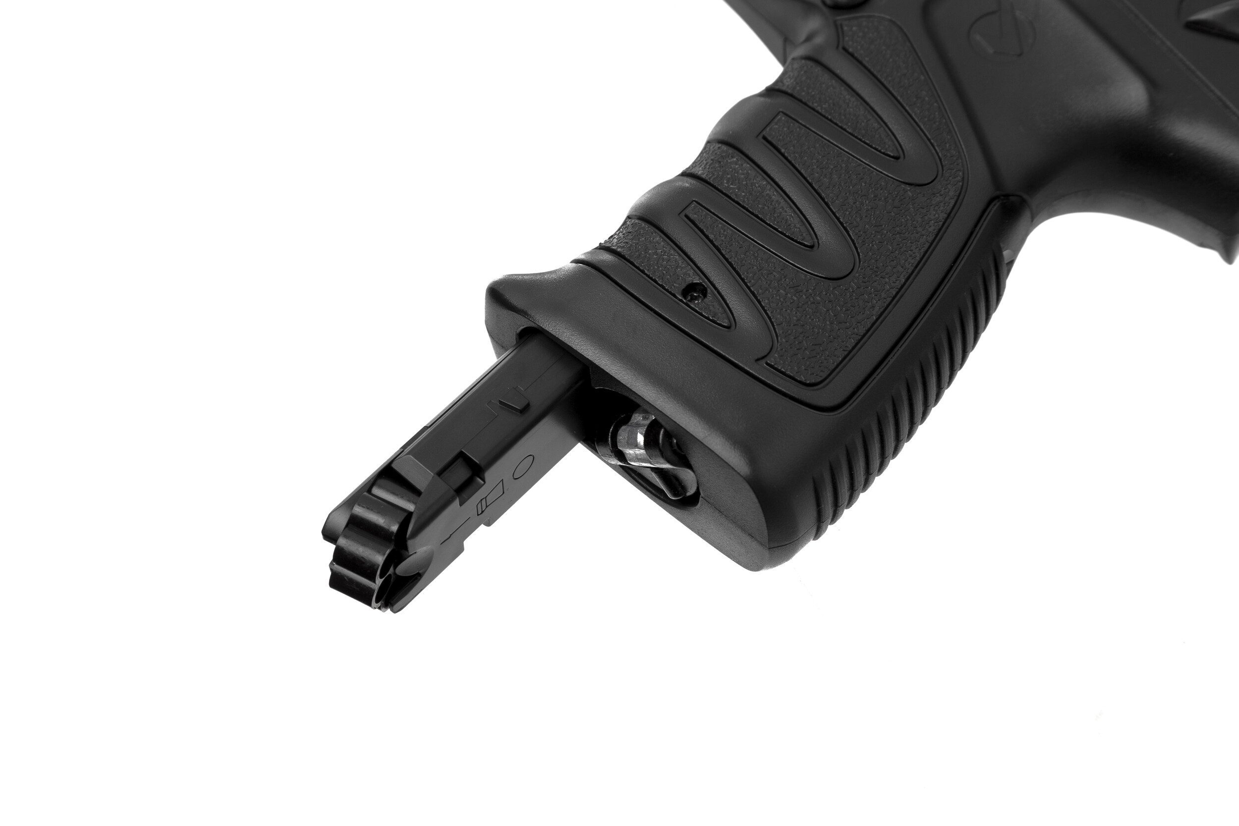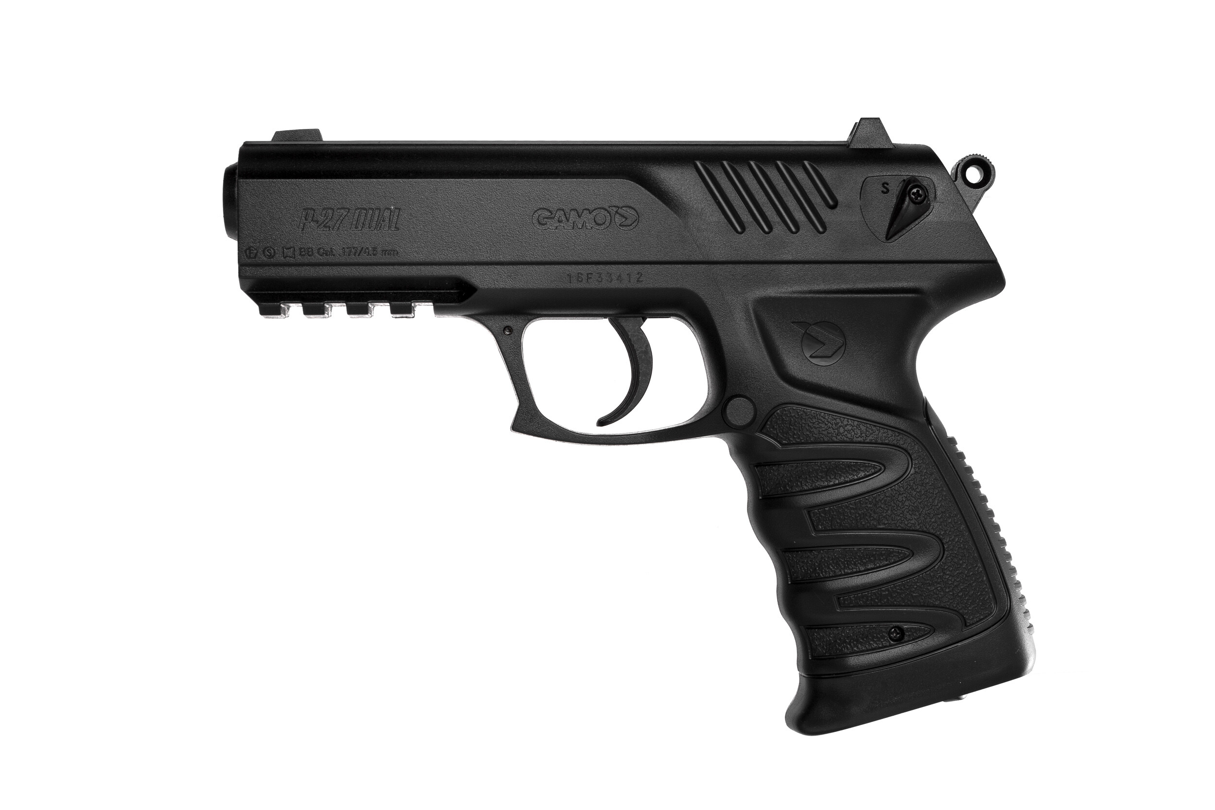 ДетальнішеПневматичний пістолет Gamo P– 27 від однойменної компанії. Стріляє кульками, початкова швидкість кулі становить 131 м/с. Працює від балона СО2 12г. В магазин даного пістолета вміщається 16 свинцевих куль. Матеріал руків'я пластик. Загальна довжина пістолета складає 180 мм. Вага без кульок та балона – 690 гамів. З прицільних пристосувань має цілик та мушку. Планка під стволом дає змогу встановити додаткове обладнання - ліхтар або лазерний цілевказівник.