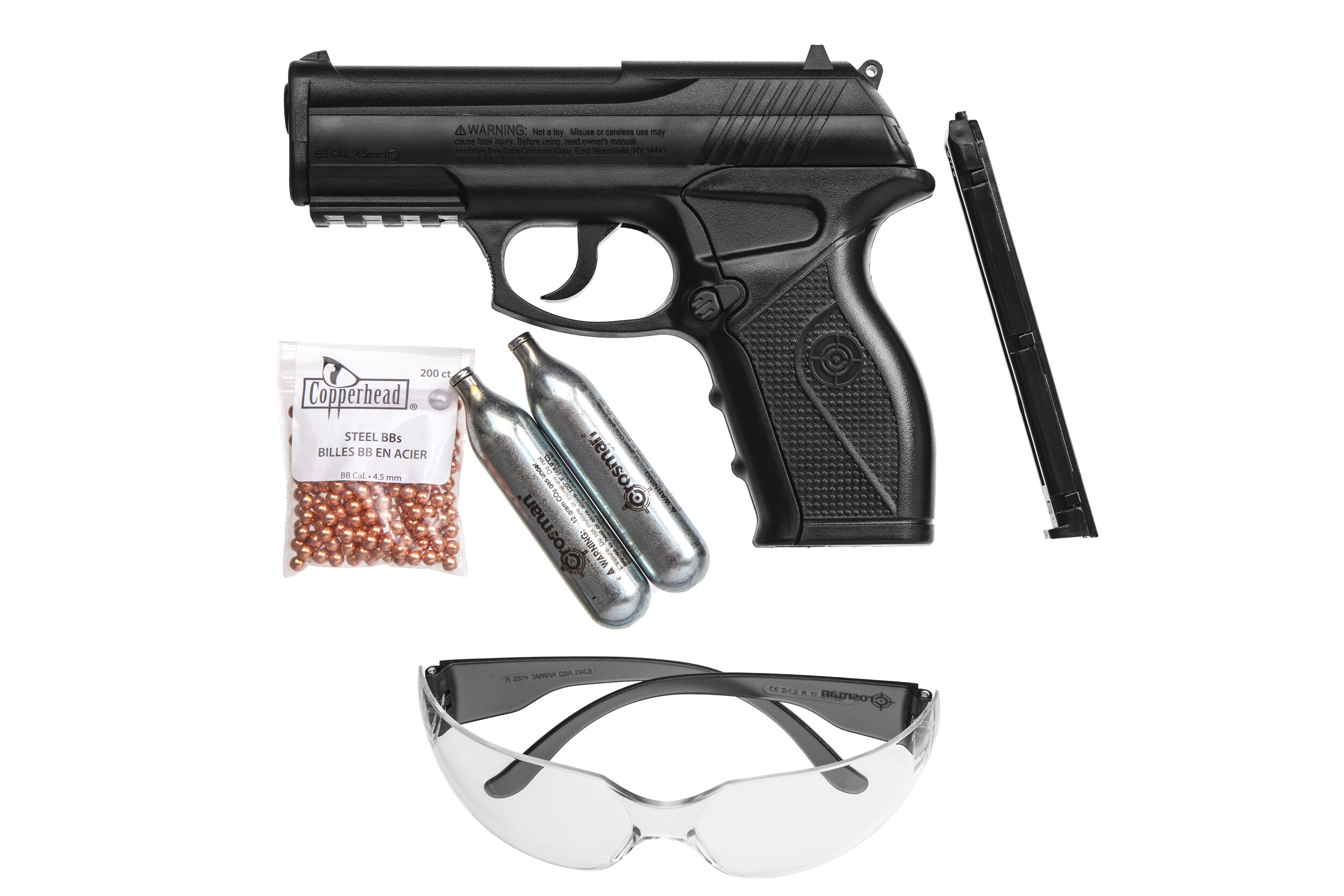 ДетальнішеСталева бочка Знімна ручка для легкої заміни CO2 Швидкознімний магазин на 20 патронів Додаткова планка під стволом для кріплення ліхтарика або лазерної указки. Виправлені цілик і мушка. Набір включає: пістолет P10, пачку Copperheads, 2 балончики CO2 і окуляри для стрільби.