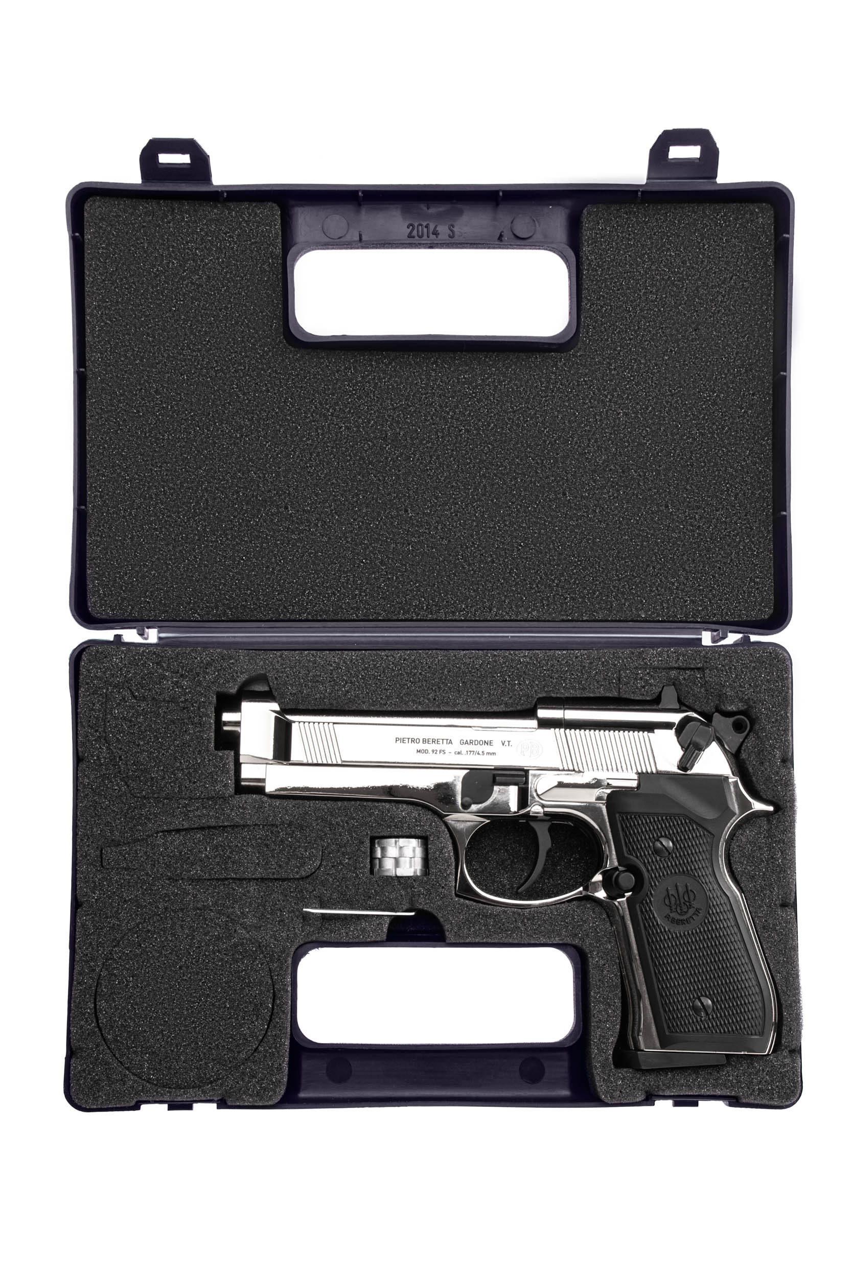ДетальнішеПневматичний пістолет Beretta 92 FS це суцільнометалевий пневматичний CO2-пістолет - точна копія бойового аналога знаменитої Беретти 92. Можливо це один з найбільш потужних пневматичних пістолетів, його вага становить 1260 гр. Це пояснюється суцільнометалевим корпусом, що зустрічається не часто в світі пневматики. Зовні пістолет вдає із себе точну копію бойового прототипу Беретти. Прицільні пристосування сприяють точному прицілюванню. Мушка нерухома, цілик регулюється по горизонталі. Пістолет характеризується точністю і щільністю пострілів. Для стрільби використовується свинцева куля калібру 4,5 мм. Стовбур гладкий, початкова швидкість кулі в момент пострілу становить 120 м / c.