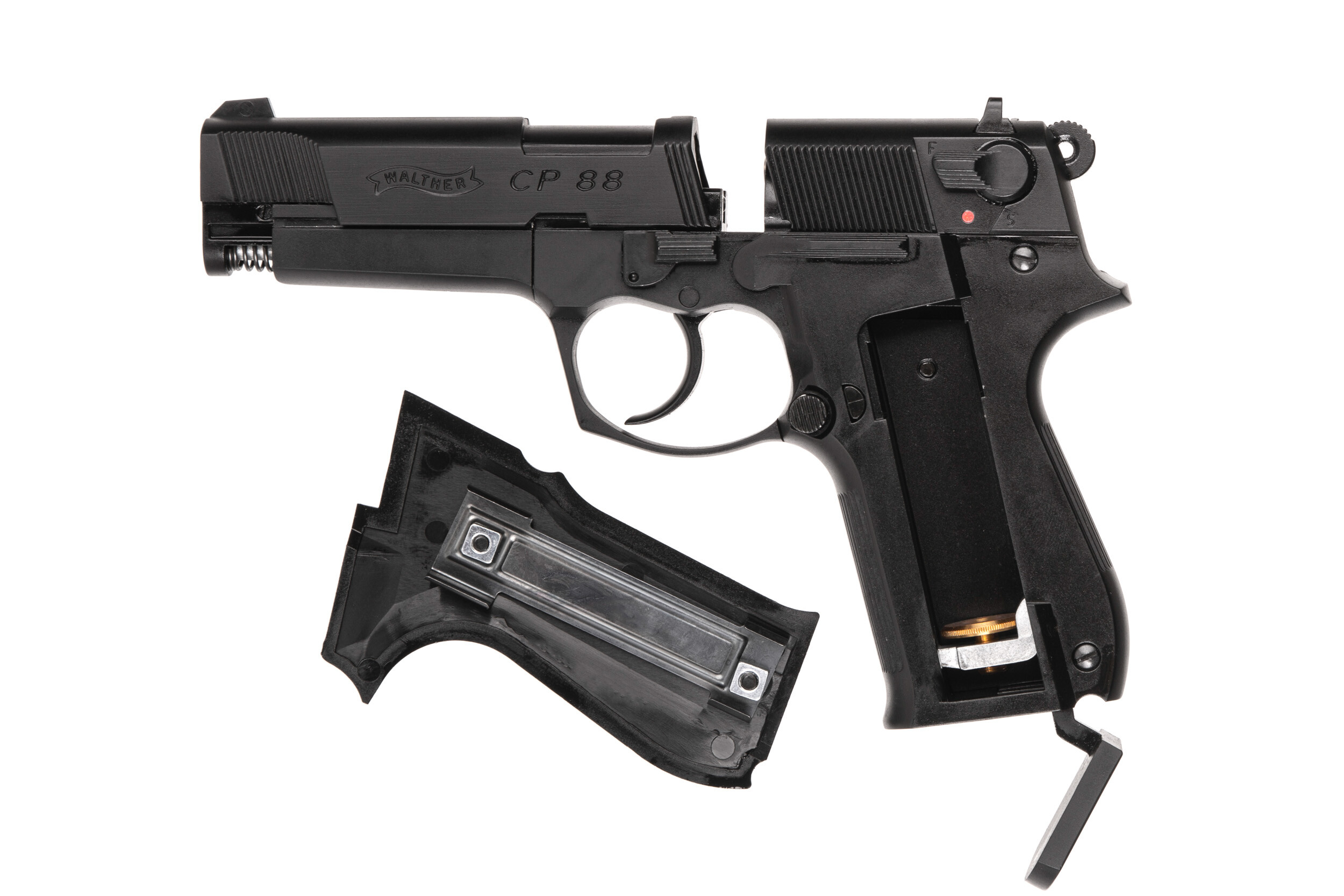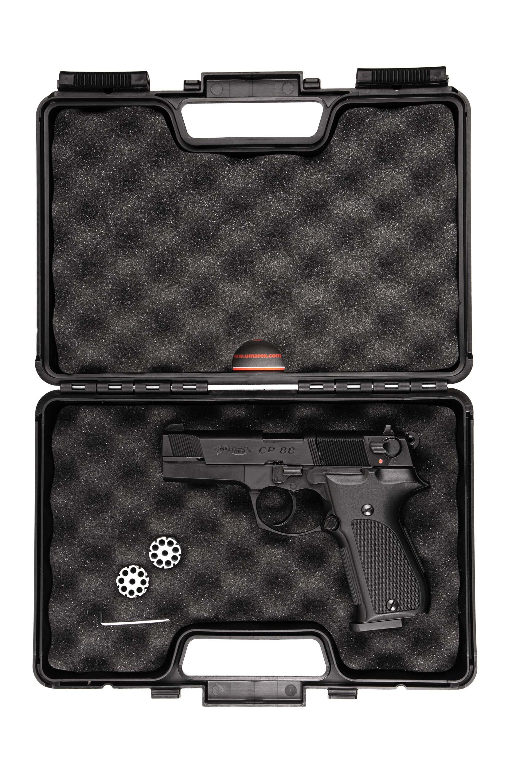 ДетальнішеЗ моменту своєї появи на ринку Walther CP88 став надзвичайно популярною пневматичною зброєю. Його точність, потужність і надійність встановили стандарти для цілого покоління розважальної зброї. Стріляє даний пістолет свинцевими кулями калібру .177, використовуючи в якості джерела енергії 12гр. балончики СО2, які вставляються в руків'я пістолета. Барабан на 8 пострілів можна швидко замінити, відкривши пістолет за допомогою важеля затворної затримки.