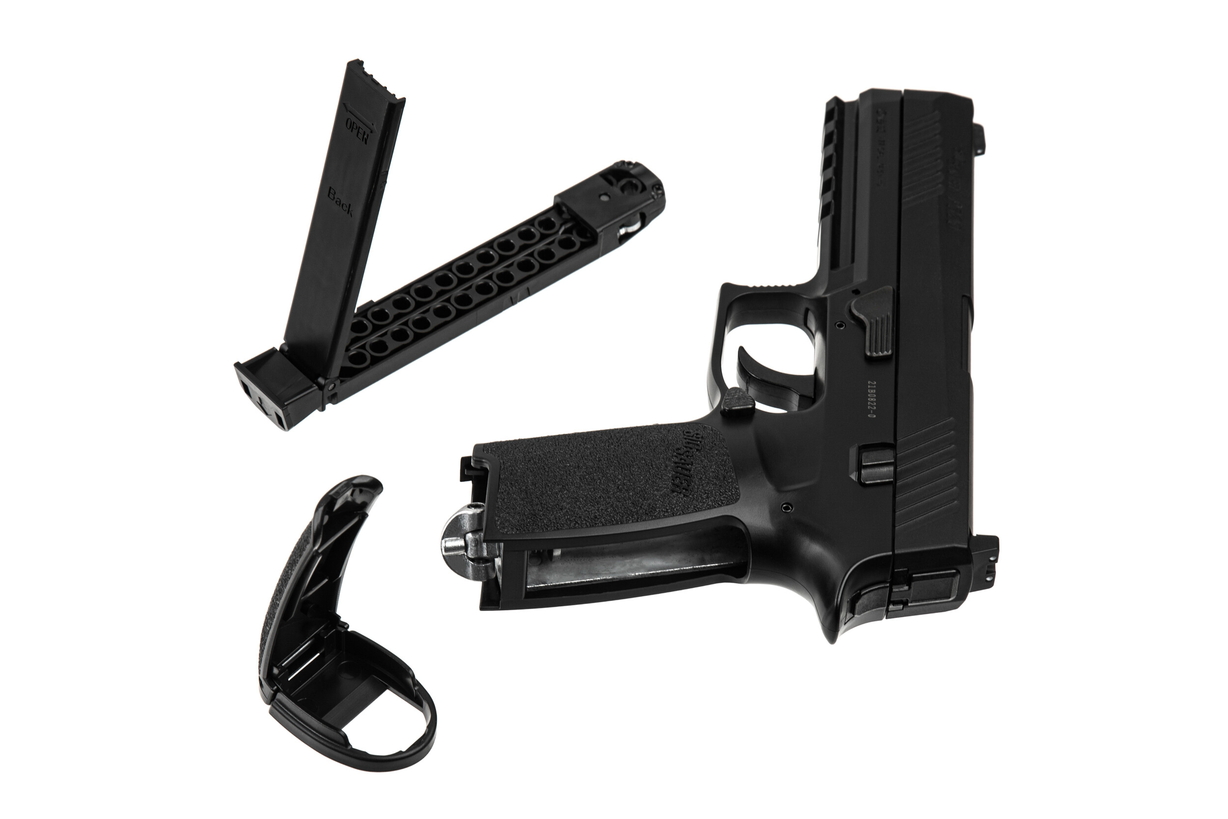 ДетальнішеГазобалонний пневматичний пістолет Sig Sauer P320 AP (Air Pistol) є реплікою бойового пістолета, який за зовнішнім виглядом, габаритами, масою і зусиллю спуску ідентичний Sig Sauer P320 Nitron Full-Size в калібрі 9 × 19мм. Модель P320 має затвор з металевого сплаву, сталевий нарізний ствол, систему імітації віддачі і руху затвора Blowback і полімерну раму з розміщеною під стволом планкою Weaver / Picatinny, для установки ліхтаря або лазерного цілевказівника. Прицільні пристосування складаються з змінною мушки з можливістю внесення бічних поправок і фіксованого цілика Пістолет SIG Sauer P320 стріляє свинцевими кулями в калібрі .177 (4,5 мм). Ємність магазина розрахована на 30 пострілів.