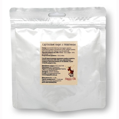 Картопляне пюре Happy Elk з телятиною - його готують по всьому світу. Телятина надає кортофелю особливий тонкий аромат, додасть вам сил в поході і гарного настрою. Прекрасне рішення для обіднього перекусу, вносить приємне розмаїття в похідне меню.