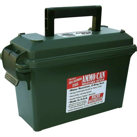 MTM Ammo Can - універсальний ящик для зберігання і транспортування великої кількості боєприпасів до нарізної зброї. Конструкція коробки дозволяє укладати патрони заводськими пачками або ж просто насипом. Для зручності перенесення оснащується складаною ручкою. Захист від води забезпечує гумовий ущільнювач під кришкою. Сама кришка надійно фіксується однією або двома засувками в залежності від моделі.. Від несанкціонованого доступу вміст можна вберегти, навісивши замок, для чого є спеціальні петлі O-ring.