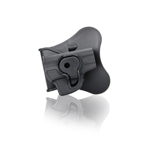 Кобура оснащена удобной кнопкой, которая обеспечивает фиксацию оружия в кобуре. Благодаря открытой конструкции извлечь пистолет из кобуры можно очень быстро, в тоже время пистолет надежно зафиксирован в кобуре, что исключает его потерю или кражу.
