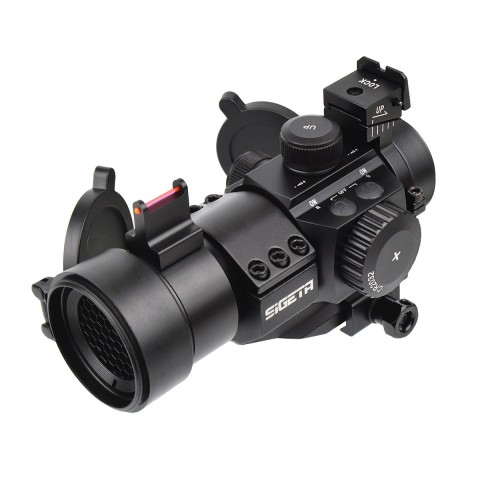 Sigeta EasyDot 1x30— рефлекторний коліматор закритого типу 2-в-1, який може використовуватись як звичайний механічний приціл. В конструкції передбачено інтегровану люмінесцентну мушку та знімний цілик з можливістю підлаштування по вертикалі та горизонталі. Коліматор має 30-мм вхідну лінзу, яка прикрита знімною антибліковою сіткою killflash. Відкидні захисні ковпачки спереду та позаду захищають оптику від бруду та механічних пошкоджень. Пристрій кріпиться на рейки Вівера або Пікатінні за допомогою 30-мм розбірного кронштейна з виносом та постійною фіксацією.Конструктивні особливості:Знімна антиблікова сітка killflashСтаціонарна люмінесцентна мушкаРухомий механічний цілик з можливістю демонтажуРозбірний 30-мм кронштейн з виносом на рейки Вівер/ПікатінніМеханізм горизонтальних і вертикальних поправокВідкидні захисні кришки спереду та позадуШвидка та легка заміна елемента живленняКнопкове керування підсвіткоюТехнічні характеристики:Тип корпусу: закритийДіаметр об'єктива: 30 ммВисота оптичної осі: 40 ммВинос вихідної зіниці: необмеженийТип прицільної сітки: точка (Dot)Розмір прицільної точки: 5 MOAПідсвітка: зелена/червонаЯскравість підсвітки: 7 рівнівМеханізм вертикальних та горизонтальних поправокЦіна кліка: 1/2 MOAПросвітлення: багатошаровеКріплення: на планку Вівер/ПікатінніКорпус: анодований алюмінійЗахист: вологозахищений, газонаповненняСумісність зі зброєю:Максимальна енергія вильоту кулі: 3500 ДжХарактеристики патрона: 12 калібр, 7.62 х 54 (.308)Комплектація:КоліматорШестигранникиБатарея CR2032Серветка для оптикиІнструкціяГабарити:Розміри прицілу: 135 х 85 х 66 ммВага прицілу: 318 гРозміри упаковки: 174 x 90 x 75 ммВага упаковки: 466 г