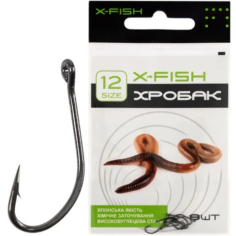 Гачок X-Fish Хробак – серія моделей з подовженою цівкою, завдяки чому вони найбільш зручні для насаджування дощових хробаків п’явок та інших подібних об’ємних наживок при лові на донні або поплавцеві оснастки. Особлива увага приділена формі та товщині дроту, завдяки чому насадки оптимально розташовуються на гачку, мають природний зовнішній вигляд, а наживки довше залишаються живими та приваблюють рибу своїм власним рухом. Для оптимального вибору гачка під особливості лову, такі як габарити або кількість насадок або наживок, розміри очікуваних особин і деякі інші, модельний ряд представлений декількома розмірами. Ці гачки чудово впораються із завданням ефективного підсікання та надійного утримання у процесі виведення будь-яких видів мирної, всеїдної та хижої риби. Гачок X-Fish Хробак – вдалий вибір для досвідчених рибалок.