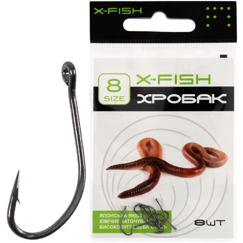 Гачок X-Fish Хробак – серія моделей з подовженою цівкою, завдяки чому вони найбільш зручні для насаджування дощових хробаків п’явок та інших подібних об’ємних наживок при лові на донні або поплавцеві оснастки. Особлива увага приділена формі та товщині дроту, завдяки чому насадки оптимально розташовуються на гачку, мають природний зовнішній вигляд, а наживки довше залишаються живими та приваблюють рибу своїм власним рухом. Для оптимального вибору гачка під особливості лову, такі як габарити або кількість насадок або наживок, розміри очікуваних особин і деякі інші, модельний ряд представлений декількома розмірами. Ці гачки чудово впораються із завданням ефективного підсікання та надійного утримання у процесі виведення будь-яких видів мирної, всеїдної та хижої риби. Гачок X-Fish Хробак – вдалий вибір для досвідчених рибалок.