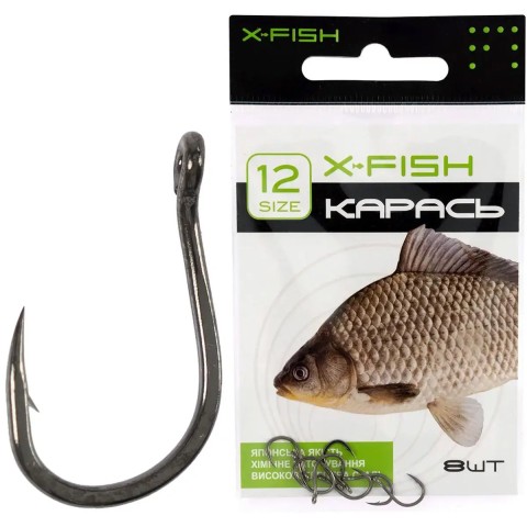 Гачок X-Fish Карась – серія моделей для лову карася поплавцевими та донними оснастками. Особливу увагу приділено формі, завдяки чому моделі отримали таке спеціалізоване призначення, що дозволяє успішно ловити цей вид риби. Для оптимального вибору гачка під особливості лову, такі як тип насадки або наживки, розміри очікуваних особин і деякі інші, модельний ряд представлений декількома розмірами. Ці гачки чудово впораються із завданням ефективного підсікання та надійного утримання в процесі виведення також і багатьох інших видів мирної риби. Вироби виготовляються із високовуглецевої сталі на японському виробництві. Хімічне заточування забезпечує виняткову гостроту жала. Гачок X-Fish Карась – вдалий вибір для досвідчених рибалок.