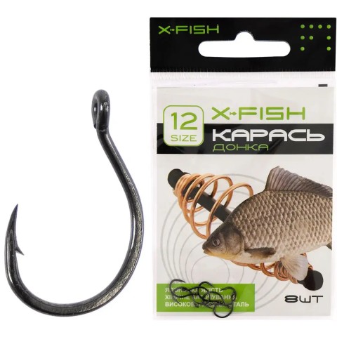 Гачок X-Fish Карась (донка) – серія спеціалізованих моделей для лову карася багато гачковими монтажами (типу пружина), де важливе самозасікання риби. Особливу увагу приділено формі, завдяки чому моделі отримали таке спеціалізоване призначення, що дозволяє успішно ловити цей вид риби. Для оптимального вибору гачка під особливості лову, такі як тип насадки або наживки, розміри очікуваних особин і деякі інші, модельний ряд представлений декількома розмірами. Ці гачки чудово впораються із завданням ефективного підсікання та надійного утримання в процесі виведення також і багатьох інших видів мирної риби. Гачок X-Fish Карась (донка) – вдалий вибір для досвідчених рибалок.