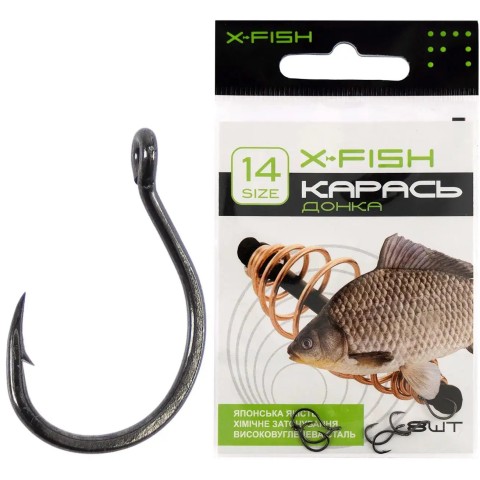 Гачок X-Fish Карась (донка) – серія спеціалізованих моделей для лову карася багато гачковими монтажами (типу пружина), де важливе самозасікання риби. Особливу увагу приділено формі, завдяки чому моделі отримали таке спеціалізоване призначення, що дозволяє успішно ловити цей вид риби. Для оптимального вибору гачка під особливості лову, такі як тип насадки або наживки, розміри очікуваних особин і деякі інші, модельний ряд представлений декількома розмірами. Ці гачки чудово впораються із завданням ефективного підсікання та надійного утримання в процесі виведення також і багатьох інших видів мирної риби. Гачок X-Fish Карась (донка) – вдалий вибір для досвідчених рибалок.