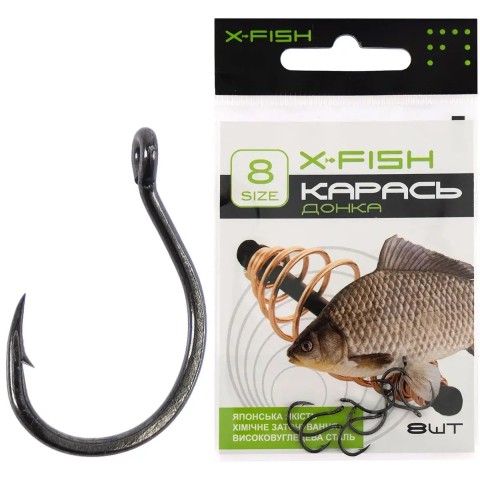 Гачок X-Fish Карась (донка) – серія спеціалізованих моделей для лову карася багато гачковими монтажами (типу пружина), де важливе самозасікання риби. Особливу увагу приділено формі, завдяки чому моделі отримали таке спеціалізоване призначення, що дозволяє успішно ловити цей вид риби. Для оптимального вибору гачка під особливості лову, такі як тип насадки або наживки, розміри очікуваних особин і деякі інші, модельний ряд представлений декількома розмірами. Ці гачки чудово впораються із завданням ефективного підсікання та надійного утримання в процесі виведення також і багатьох інших видів мирної риби. Гачок X-Fish Карась (донка) – вдалий вибір для досвідчених рибалок.