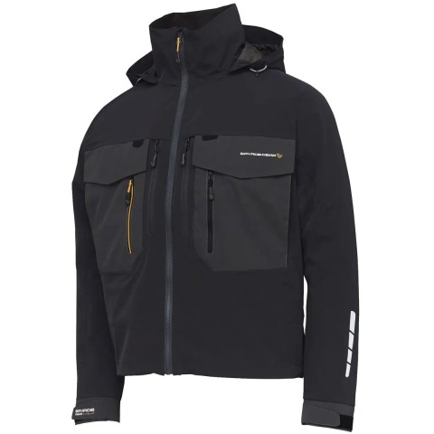Куртка Savage Gear SG6 Wading Jacket – спеціалізований верхній одяг для риболовлі. Вона має вільний крій та укорочений фасон, щоб спінінгіст відчував себе комфортно, перебуваючи у забродах у воді та здійснюючи множинні закидання приманки. Куртка виконана за найсучаснішими технологіями з еластичної тканини Toray із мембраною Dermizax водонепроникністю 20000 мм та паропровідністю 10000 мм. Ці особливості, а також проклеєні шви та додаткова обробка DWR Finish дозволяють вільно продовжувати риболовлю в умовах дощу та вітру. Об’ємний капюшон з козирком та регулюваннями, у поєднанні з високим коміром, допоможуть захистити голову та шию від негоди. Куртка має достатню кількість кишень для снастей та інструменту, деякі з них оснащені водонепроникними блискавками. Подвійні регульовані манжети запобігають затіканню води всередину під час активних рухів руками.