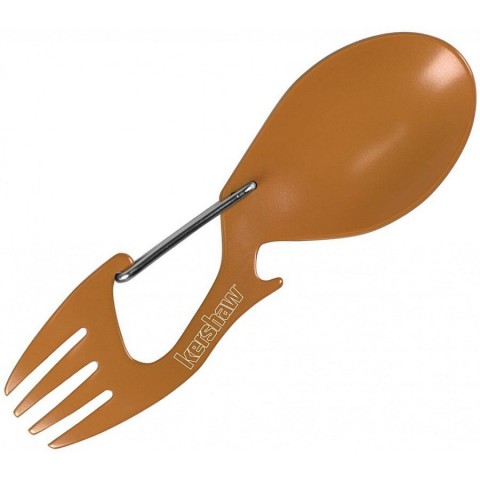Kershaw Ration - компактний і міцний мультифункціональний столовий прилад, що поєднує в собі ложку і виделку. Виготовлений зі сталі з матовим антикорозійним покриттям. Вбудований карабін дозволяє розмістити інструмент на сумці, рюкзаку та іншому похідному спорядженні, а також може бути використаний в якості відкривачки для пляшок.