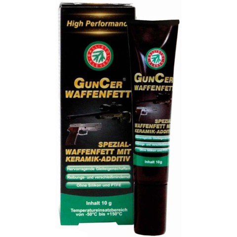Збройова мастило GunCer завдяки додаванню спеціальної керамічної присадки і широкому температурному діапазону застосування (від-50°С до +150°С) гарантує максимальний захист оброблених деталей від зносу і корозії. Для змащення всіх ковзних з'єднань, наприклад, напрямні затвора, ролики спускового гачка, стопори, бойові виступи, Шарнірні болти, а також в якості допоміжного засобу для монтажу різьбових і штифтових з'єднань. Також ідеально підходить в якості монтажної пасти для установки змінних чоків. Володіє нейтральною дією на пластик, лак, дерево і вороноване покриття. Біла спеціальна мастило з нейтральним запахом не містить смоли і кислоти, а також тефлону і силікону. Керамічна присадка гарантує антифрикційні властивості. Дуже хороші адгезійні характеристики без злипання або затвердіння!