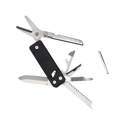 Модель оснащена декількома повноформатними інструментами: ножем та ножицями. Клинок має класичну форму Drop Point і пряме заточування, що робить з нього універсальний інструмент, актуальний для нарізання продуктів харчування, перерізування мотузок та зрізання дрібних гілок. Ножиці мають рукоятки зручної довжини, тому не вислизають із руки і не тиснуть шкіру долоні під час різання паперу, кабелю і навіть таких щільних матеріалів, як гума та вироби зі шкіри.