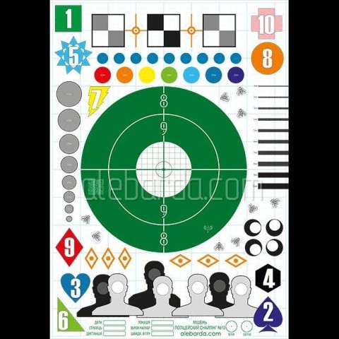 Эта уникальная мишень специально разработана для проведения тренировок по высокоточной стрельбе/ снайпингу таким образом, чтобы с помощью ее одной была возможность тренировать практически все необходимые навыки: холодный выстрел, стрельбу из неудобных положений, стрельбу с переносом, заложник, жадность, темповую стрельбу и т.д. Центральная часть мишени зеленый круг точно соответствует центру общевойсковой мишени №4, в верхней части для пристрелки есть фрагмент мишени наклейки.