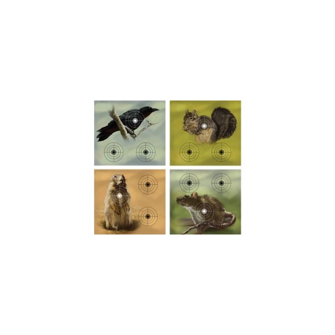 Полноцветные бумажные мишени размером 24х22,5 см с изображением животных. На каждой мишени размещено по 3 цели. Каждая упаковка содержит 20 мишеней.