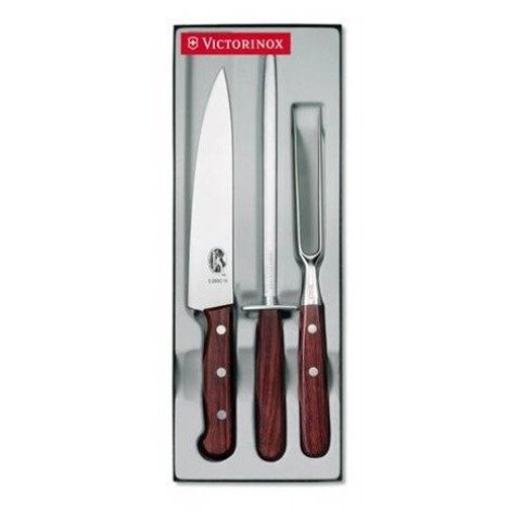 Кухонный набор от швейцарского бренда Victorinox состоит из разделочного ножа длиной 19 см. и поварской вилки для разделки, длиной 15 см и мусата 20 см. Рукоять изготовлена из красного дерева. Лезвия выполнены из высококачественной нержавеющей стали. Подарочная упаковка.