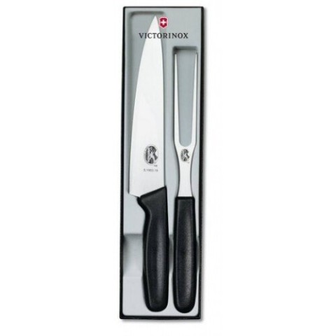 Кухонний набір від швейцарського бренду Victorinox складається з обробного ножа завдовжки 19 см.та кухарської виделки для оброблення довжиною 15 см. Руків'я виготовлене з чорного матового поліпропілену Fibrox. Леза виконані з високоякісної нержавіючої сталі. Подарункова упаковка.