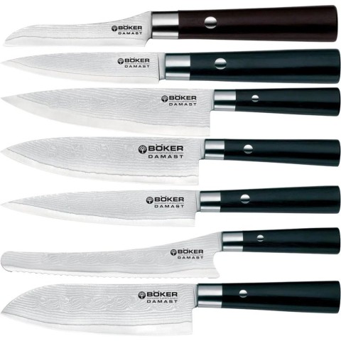 Boker Damast Black Set - це набір кухонних ножів, які популярні не тільки серед шеф-кухарів, а й серед багатьох амбітних кухарів-аматорів. Дамаські клинки ножів виготовлені зі сталі VG-10, яка відрізняється твердістю, пружністю та однорідною структурою. Руків'я ножів виготовлені з Pakka Wood - це назва просоченого дерев'яного шпону, який широко використовується у виробництві ножів.