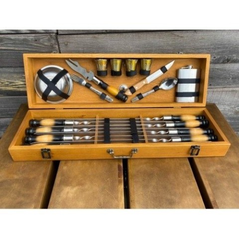 Інформація про набір шампурів ОсаулНеймовірний подарунок для любителів активного відпочинку! Все необхідне для приготування різних страв на багатті. Такий набір стане відмінним подарунком для ваших рідних, близьких, друзів або колег по роботі. Оригінальний, солідний і 100% необхідний кожному.
