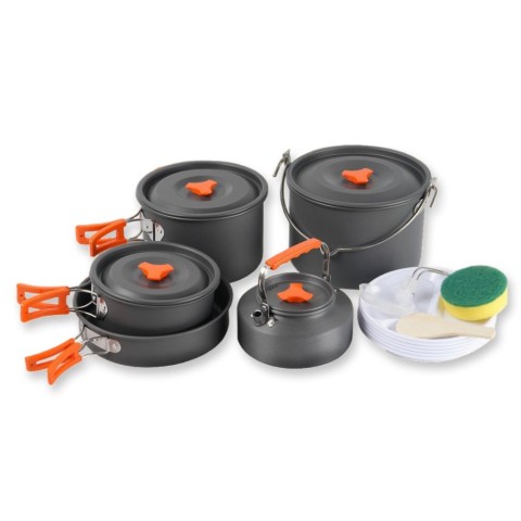 Набір туристичного посуду (2 каструлі з кришкою, котелок, сковорідка, чайник, 6 тарілок, ложка, черпак та губка) BRS-157, алюміній