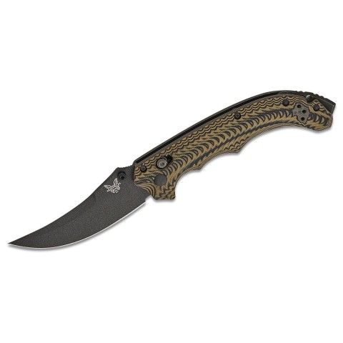 Лезо Клинок, виконаний з високоякісної сталі CPM‑S90V, має видатну здатність до утримання гостроти та довговічності навіть при інтенсивному використанні. Його характерна форма в стилі скімітара з ефектно піднятим (upswept) кінцем не лише надає ножу сміливого і динамічного вигляду, але й оптимізує ріжучі властивості, забезпечуючи плавні та точні зрізи. Поверхня леза оброблена покриттям Black Cerakote, що захищає від корозії та механічних пошкоджень.