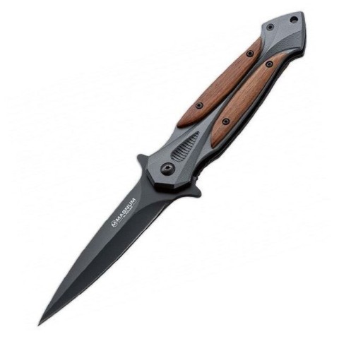 Складаний ніж Boker Magnum Starfighter виконаний у вигляді кинджала. Клинок з нержавіючої сталі 440 має чорне антикорозійне покриття і чудово гармонує з дерев'яна яними накладками рукояті. Ніж приводиться в робоче положення за допомогою фліппера, який також виконує роль гарді і запобігає зісковзування пальців руки на клинок.