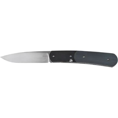Boker Plus Dogleg Auto – нове творіння ножового концерну Boker спільно з дизайнером Стеном Мойзісом. Модель є компактним, джентльменським ножем для щоденного використання. Клинок профілю Drop Point виготовлений із міцної, зносостійкої сталі D2. Фінішна обробка - філігранний сатин з найтоншими, як волосок, лініями. Наводиться в робоче положення та закривається за допомогою зручної кнопки у поглибленні рукояті. Легкий вигин рукояті з двоскладовими накладками із нержавіючої сталі чорного кольору та G10 сірого, комфортно лягає в руку. На торці розміщена дротяна кліпса для прихованого носіння.