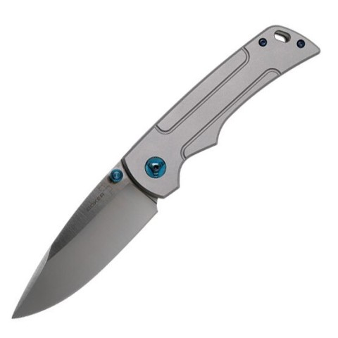 Сатинований клинок типу Drop point виготовлений зі сталі D2, здатної довгий час зберігати гостроту ріжучої кромки. Завдяки шарикопідшипнику він легко витягується однією рукою за допомогою шпенька і надійно фіксується замком Frame lock. Накладки рукояті виконані з нержавіючої сталі. Є знімна кишенькова кліпса і отвір для кріплення темляка. Гвинти, шпенек і кишенькова кліпса анодовані у синій колір, що створює приємний контраст з сріблястим відтінком рукояті.