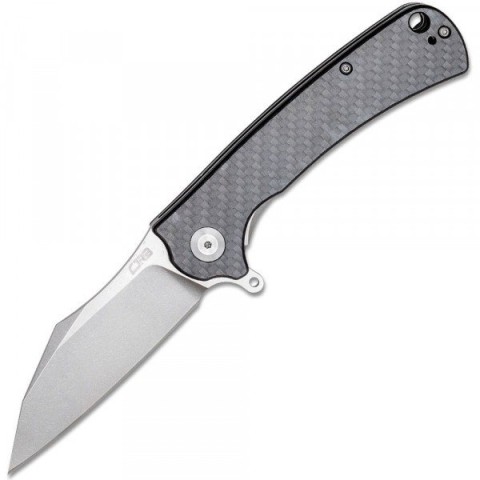Клинок плавно переходить в ергономічну ручку. Накладки виготовлені з вуглецевого волокна, що забезпечує впевнене утримання ножа навіть мокрими руками.