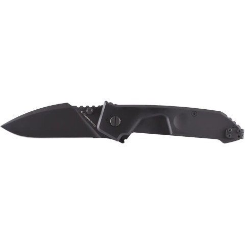 Широкий клинок профілю Drop Point наділяє ніж відмінними колючими ріжучими якостями, а легована кобальтом сталь Böhler N690 твердістю 58 HRC добре витримує інтенсивні навантаження, у тому числі і поперечні. Фінішне покриття клинка Black Oxide MIL-C-13924 чудово захищає від корозії і може змінюватись в залежності від моделі: чисто чорне або з лазерним гравіюванням у вигляді маскувальних смуг. Для комфорту та впевненості під час використання, на обусі розміщено низку потужних насічок для упору великим пальцем. Наводиться в робоче положення як лівою, так і правою рукою, за допомогою двостороннього шпенька. Фіксується у відкритому вигляді за допомогою надійного замку Liner Lock. Extrema Ratio подбала про безпеку і для запобігання випадковому відкриттю було встановлено запобіжник, який надійно фіксує клинок у відкритому або закритому положенні. Також лінійка MF отримала нововведення - регулювальний осьовий гвинт, завдяки якому можна відрегулювати плавність виходу клинка.