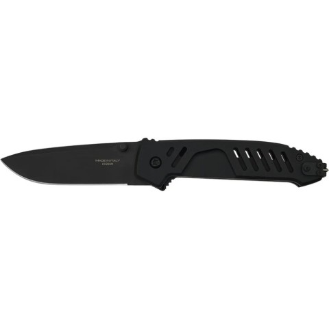 Широкий клинок профілю Drop Point наділяє ніж відмінними колючими і різальними якостями, а легована кобальтом сталь Böhler N690 твердістю 58 HRC добре витримує інтенсивні навантаження, у тому числі і поперечні. Фінішне покриття клинка Black Oxide MIL-C-13924 чудово захищає від корозії і може змінюватись в залежності від моделі: чисто чорне або з лазерним гравіюванням у вигляді маскувальних смуг. Для комфорту та впевненості під час використання, на обусі розміщений ряд масивних насічок для упору великим пальцем. Приводиться в робоче положення як лівою, так і правою рукою, за допомогою двостороннього шпеника. Фіксується у відкритому вигляді за допомогою надійного замка Liner Lock. Extrema Ratio подбала про безпеку і для запобігання випадкового відкриття був встановлений запобіжник, який надійно фіксує клинок у відкритому або закритому положенні. Також лінійка MF отримала нововведення – регулювальний осьовий гвинт, завдяки якому можна відрегулювати плавність виходу клинка.