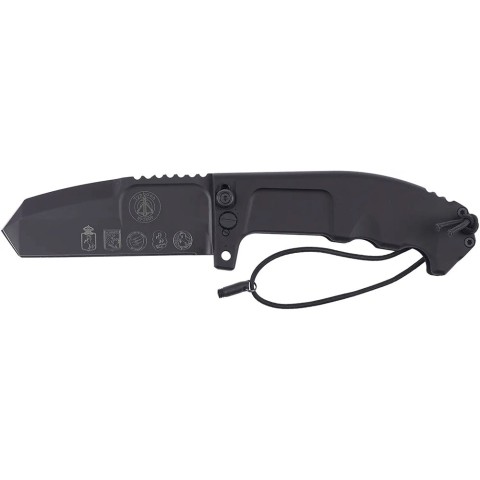 Ніж має надійну систему замикання, яка доповнена додатковим запобіжним пристроєм - сталевим штифтом, що вкручується вручну у два спеціальні отвори в нижній частині руків'я. Така система фактично перетворює цей фолдер на ніж з фіксованим лезом. Відкриття та закриття слід виконувати обома руками, щоб звести до мінімуму ризик самопоранення.