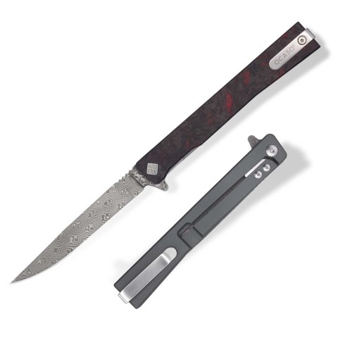 Fat Carbon® - це міцний і легкий композит із вуглецевого волокна, який, здається, змінюється та "грає" під впливом світла, що ідеально поєднується з ефектним клинком з дамаської сталі.