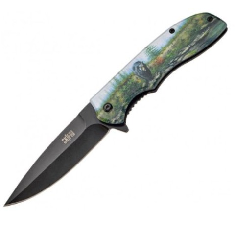 Рукоять зручної форми, прекрасно лежить в руці, має накладки з алюмінію з чорним покриттям, на одній з яких — кольорове зображення ведмедя породи Кодьяк. У складеному вигляді ніж носиться в положенні tip-down на односторонній кліпсі.