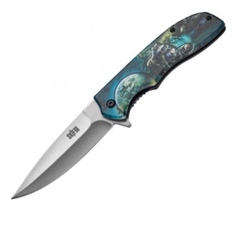 Рукоять зручної форми, прекрасно лежить в руці, має накладки з алюмінію з чорним покриттям, на одній з яких кольорове зображення пари вовків на тлі повного місяця і лісового водоспаду. У складеному вигляді ніж носиться в положенні tip-down на односторонній кліпсі.