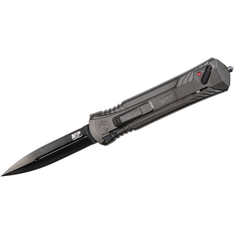 Smith&Wesson M&P OTF - це ніж з функцією фронтального відкривання відомого збройового бренду Smith & Wesson. Він оснащений запобіжником та виступом збоку, який використовується для втягування леза на додаток до напрямної кнопки-повзунка. До механізму необхідно трохи звикнути, т.к. з коробки він може показати тугуватим, але це дійсно вражаючий ніж. Створений у дусі класичної "тактики", ніж має тонкий профіль і антивідблиск оздоблення. Клинок з нержавіючої сталі AUS-8 має довжину 8,9 см і виконаний у вигляді двостороннього кинджала, що дуже нагадує подібні моделі від Benchmade або Microtech OTF Automatic. Алюмінієві рукоятки мають фрезерований контур для кращого утримання і включають навершие-склобій, кишеньковий затискач і запобіжник.