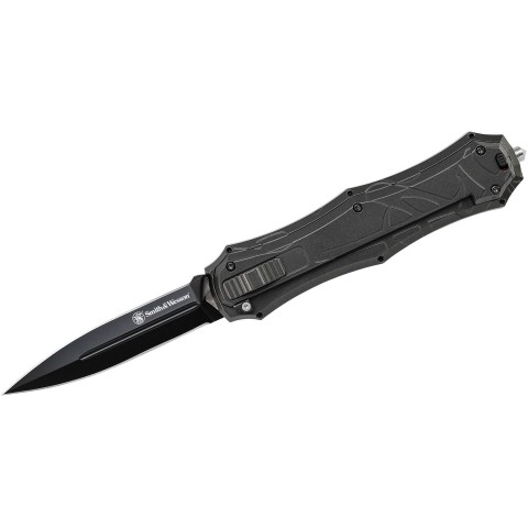 Smith&Wesson OTF - це ніж з функцією фронтального відкривання відомого збройового бренду Smith & Wesson. Він оснащений запобіжником та виступом збоку, який використовується для втягування леза на додаток до напрямної кнопки-повзунка. До механізму необхідно трохи звикнути, т.к. з коробки він може показати тугуватим, але це дійсно вражаючий ніж. Створений у дусі класичної "тактики", ніж має тонкий профіль і антивідблиск оздоблення. Клинок з нержавіючої сталі AUS-8 має довжину 9,2 см і виконаний у вигляді двостороннього кинджала, що дуже нагадує подібні моделі від Benchmade або Microtech OTF Automatic. Алюмінієві рукоятки мають фрезерований контур для кращого утримання і включають навершие-склобій, кишеньковий затискач і запобіжник.