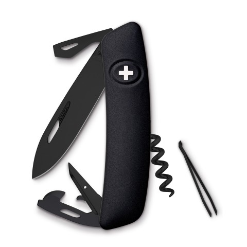 Swiza All Black - ваш маленький чорний ніж, незамінний в будь-якій ситуації. «Мій стиль, моя Swiza» (с). Модель Swiza D03 поставляється з наступними 11 інструментами: * матовий міцний нержавіючий клинок довжиною 75 мм (440C \ 57 HRC); * штопор розміру «Сомельє» із загартованої неіржавіючої сталі на 5 витків; * шило з швейним вушком \ дирокол, що дозволяють проткнути шкіру і багато інших міцних матеріалів; * консервний ніж; * ключ для відкривання пляшок; * плоска викрутка №3 на кінці ключа для пляшок; * плоска викрутка №1 на кінці консервного ножа; * інструмент для зняття ізоляції з проводів і згинання дроту; * пінцет зі скошеними кінцями для високої точності при видаленні колючок; * замок Safety Lock, що фіксує клинок у відкритому положенні і не дає йому скластися на пальці. Всі інструменти покриті спеціальним PVD покриттям, завдяки чому вони пробрели глибокий насичений чорний колір. Складаний ніж SWIZA - це сучасне прочитання швейцарської класики. Бренд SWIZA передбачає зручність і практичність в повсякденному використанні в поєднанні з автентичною швейцарською стилістикою і орієнтований на людей з динамічним способом життя. SWIZA - зручний, стильний і простий у використанні швейцарський ніж, адже він поєднує в собі тільки ті функції, які можуть знадобитися щодня. Нічого зайвого: «A great challenge: concentrating on the basics and eliminating superfluities» «Відмінне завдання: зосередитися на засадах і усунути надлишкові функції» Ножі виготовлені з нержавіючої сталі марки 440C, загартованої до 57 одиниць за шкалою Роквелла. Такі показники є оптимальними для щоденного використання і легкої заточки. Складні багатофункціональні ножі Swiza мають ряд унікальних особливостей. Ергономічна вигнута форма та м'яка нековзна рукоять з матового прогумованого полімеру Soft touch роблять її більш зручною для зберігання і роботи. Такі ножі дійсно виділяються серед інших швейцарських ножів. Ножі Swiza безпечні. Замок Safety Lock, вбудований в швейцарський хрест на рукояті, активується натисканням на заховану в ньому кнопку. Надійно зафіксований лайнер не дасть клинку скластися вам на пальці. Розкрийте клинок і насолоджуйтеся чудовим безпечним різом. Для того, щоб закрити ніж, необхідно затиснути хрест і плавно заховати клинок в рукоять. На відміну від інших ножів, вам необхідно просто затиснути кнопку, а не відсувати сам лайнер всередині рукояті. Інструменти Swiza мають зручні прорізи, що дозволяють з легкістю діставати їх з рукояті як правші, так і лівшам. Крім того, вони дозволяють зберегти нігті, що так важливо для представниць прекрасної статі. Ножі Swiza невибагливі в догляді: ви можете мити їх як під проточною водою, так і в посудомийній машині в воді до 80 градусів, однак постарайтеся помістити ніж в машині окремо від решти забрудненого посуду. Обов'язково протріть насухо кожен інструмент після миття. Окремим пунктом варто відзначити дизайн, адже різноманіття кольорів та візерунків рукояті задовольнить вимоги як прихильника класики, так і любителя яскравих незвичайних аксесуарів. Універсальний чорний або класичний червоний? Життєрадісний оранжевий або безтурботний блакитний? А, може, бездоганний білий або камуфляж? Обирати тільки вам, адже це ще не все колірні рішення, в яких доступні ножі Swiza. Довідка про компанію. Компанія Helvetica Brands S.A. веде свою історію з 1904 року, коли Луї Шваб заснував виробництво високоточних механічних годин