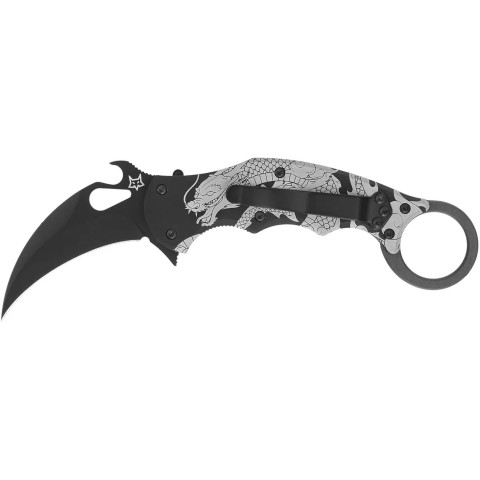 Fox Karambit - це складаний керамбіт, із виразним бойовим характером, створений для екстремальних ситуацій і водночас придатний для щоденного носіння. Клинок виготовлений зі сталі Böhler N690Co, що забезпечує чудову зносостійкість, утримання ріжучої крайки та стійкість до корозії. Ніж відкривається трьома способами - класичний фліпер, отвір у клинку (зручно навіть у рукавичках) або фірмовий гачок Emerson Wave, який автоматично відкриває лезо при вихопленні з кишені. Фіксація здійснюється перевіреним замком Liner Lock, який надійно блокує клинок у відкритому положенні.